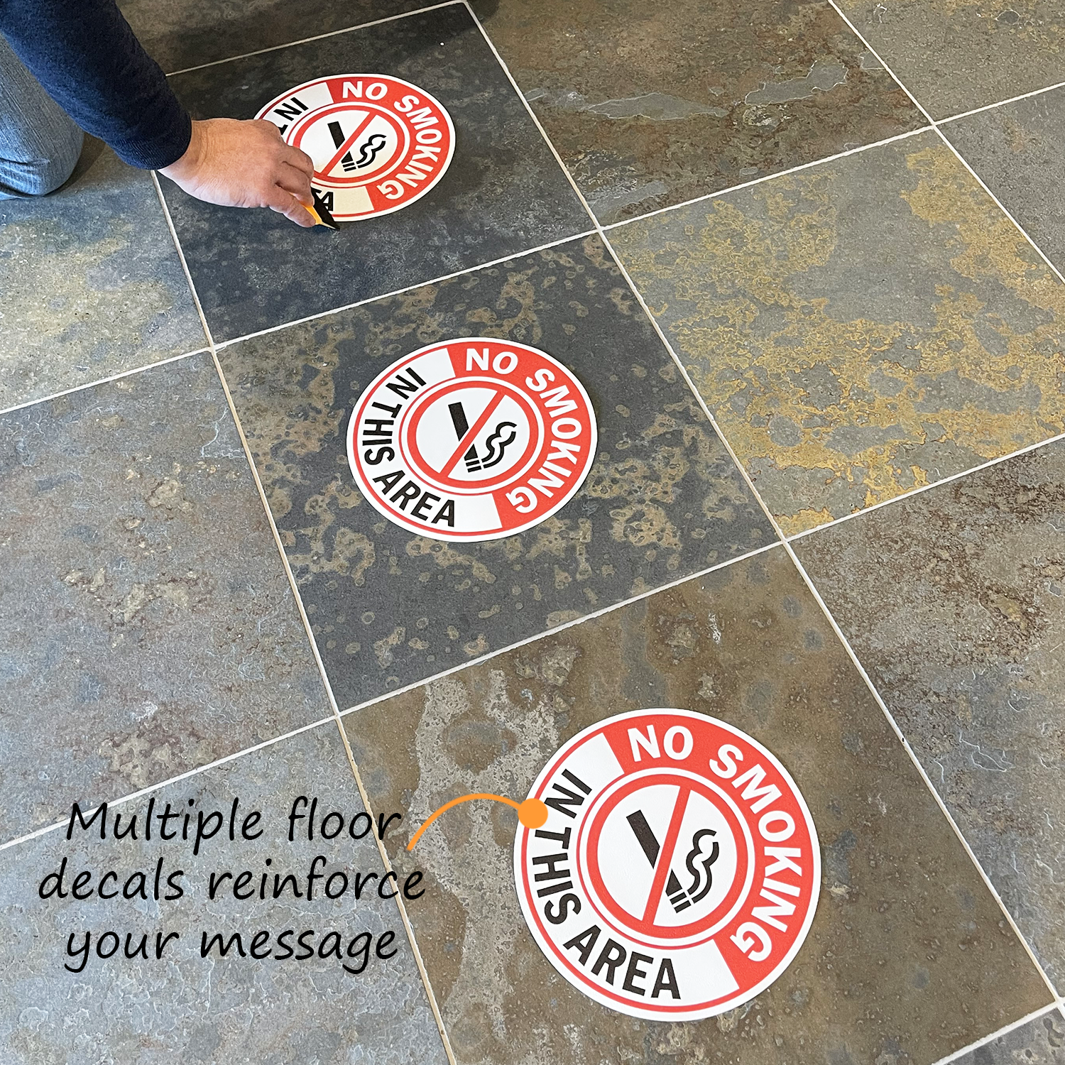 Absolutely! Our custom floor decals feature a textured, enclosed grit-top surface that makes slipping on these signs highly unlikely. The aggressive adhesive backing ensures the decals stay in place.
