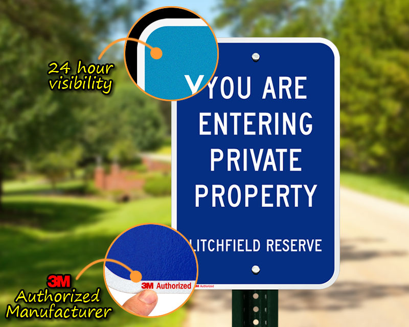 You may choose your custom reflective sign depending on the visibility desired. Where engineer-grade reflective signs can be seen from approximately 500 feet away, high-intensity reflective signs can be seen from 1000 feet away, and diamond-grade from 1500 feet.