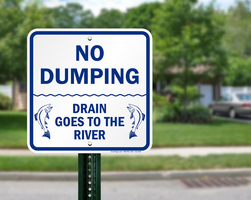 Help keep our oceans and rivers clean. Overflow from storm sewer systems can cause real damage to our waterways and ocean. No Dumping, Drains to River Signs provide a hard-to-miss reminder.