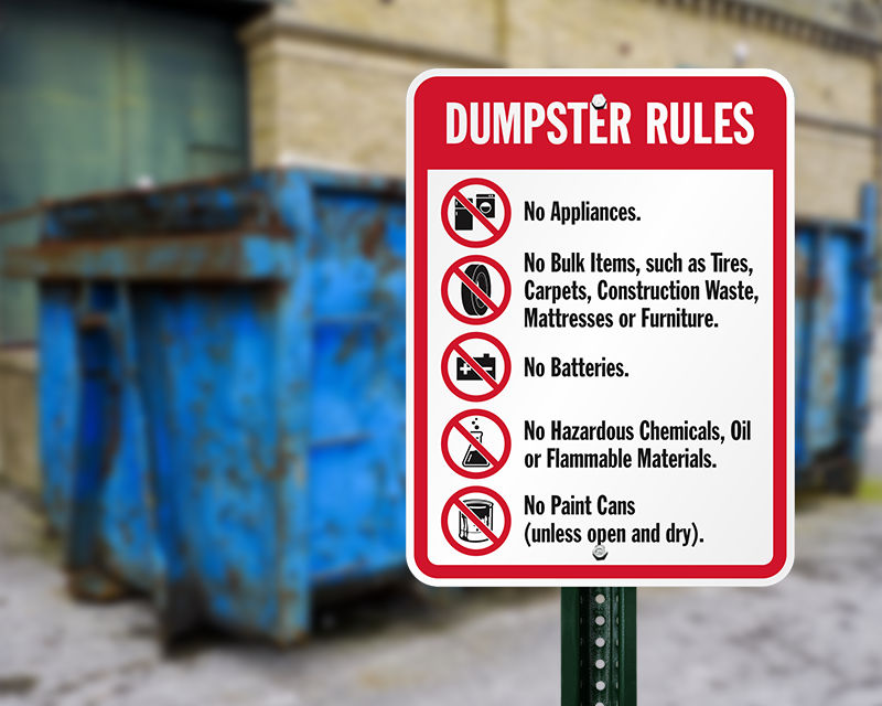 Your garbage will never really be clean, but post dumpster rules to keep things in order. Choose from aluminum or a range of reflective grades.
