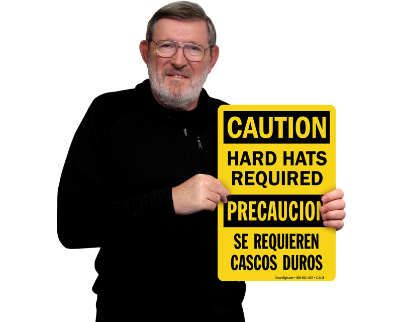Absolutely. To ensure every worker understands the rules, we provide bilingual signs that feature both English and Spanish text. We also offer signs that prominently feature the universal hard hat pictogram, which provides an immediate visual cue that is easily understood regardless of a worker's language or reading ability.