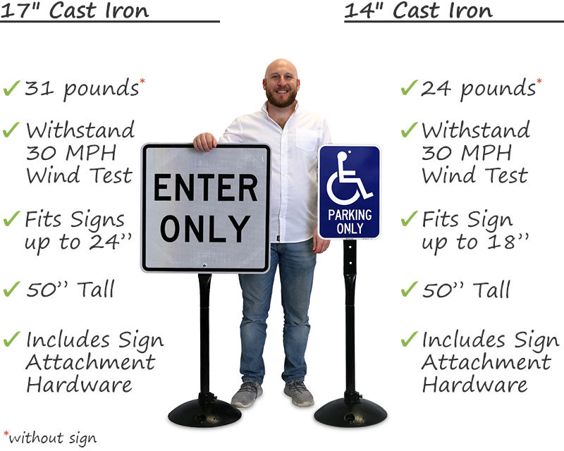Other than aluminum sign bases, which must be bolted down, our iron and rubber sign bases are designed to offer good resistance to winds. For greater stability, you can bolt down the cast iron bases as well, add sand or water to the roll ‘n’ pole base, and use a 75 lbs anchor available on the site with the rubber sign base.