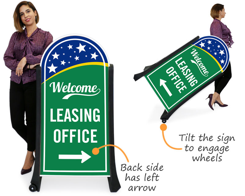 Yes, many of the designs specifically feature directional arrows (left, right, or upward) to clearly point visitors toward the leasing center. This is a key feature for efficient wayfinding on large properties.