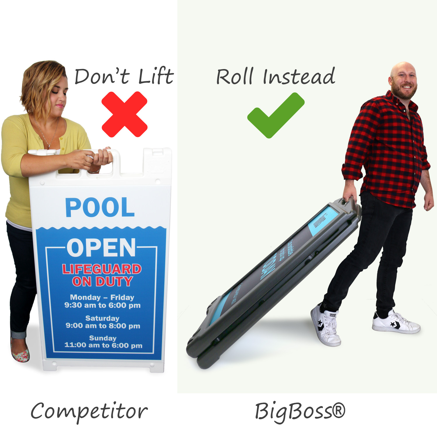 • BigBoss frames include wheels. Roll your sign anywhere. Frame is also foldable. Tuck your sign in a closet for storage.